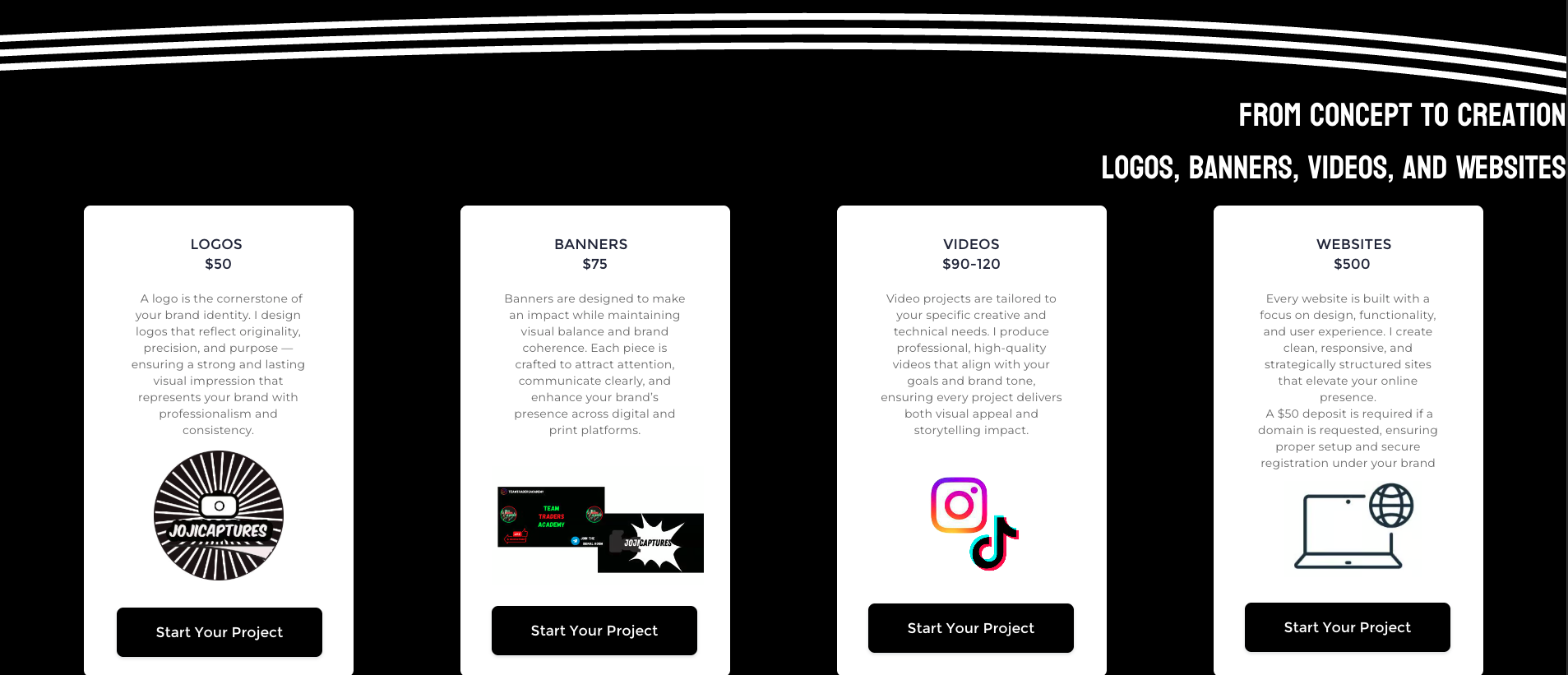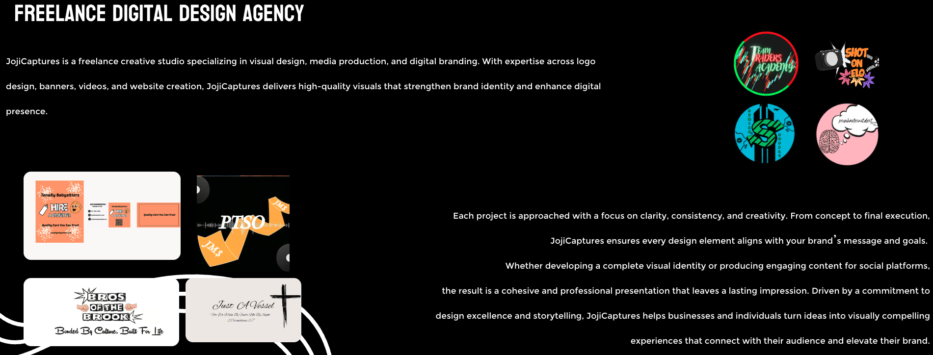 JojiCaptures is my freelance creative agency focused on designing logos, banners, videos, and websites for entrepreneurs and businesses. The original website was basic, unresponsive, and lacked an appealing user interface, which made it difficult to attract potential clients. My goal was to redesign the site so that it not only looked professional but also communicated the value of my services clearly and engaged users to start their projects