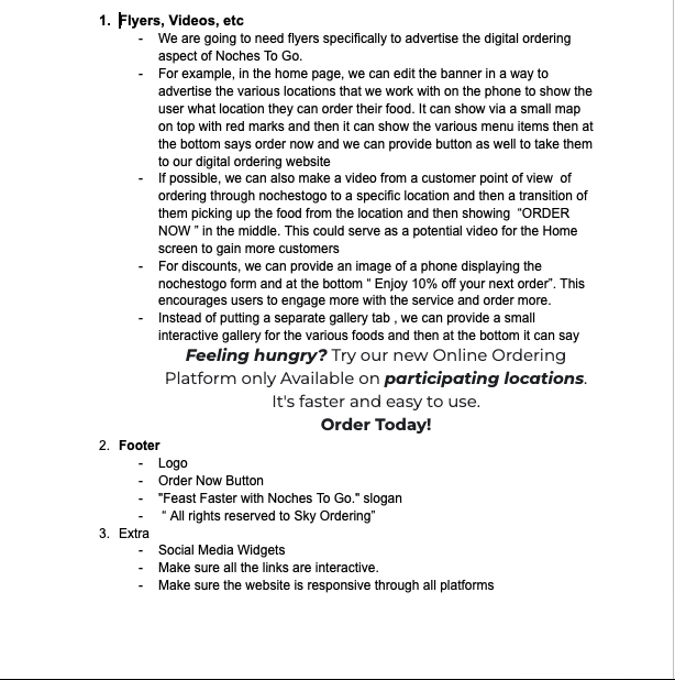 To begin the project, I met with my boss, Jason, to identify the improvements needed, with the main priority being to enhance the user experience and make the site feel more like a dedicated ordering app. I conducted competitive research by studying well‑known restaurant websites and analyzing how they used typography, visual hierarchy, photography, videography, and layout to guide user behavior. This research helped me understand how successful platforms structure content to improve user flow, reduce friction, and encourage ordering, ultimately shaping the design direction for Noches To Go.