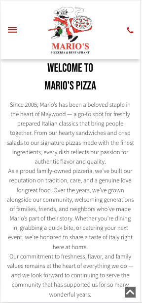 The old site failed to represent Marios Pizza as a professional business. It lacked structure, clarity, and visual appeal. The redesign needed to solve these issues by creating a clean layout, adding navigation elements, incorporating visual content , and presenting information in a way that was easy for customers to understand and engaging enough to draw them in.