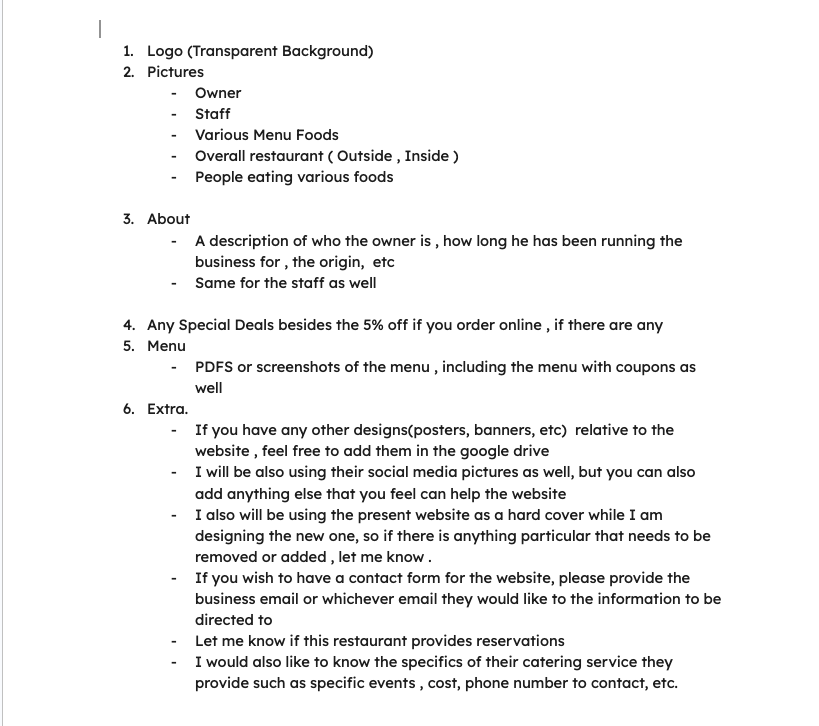 I met with my associate to discuss her boyfriend’s goals for the website. Their priorities included a responsive layout, a clear presentation of the business, an appealing UI, and a well-structured menu to showcase food options. We also explored ways to incorporate photos and videos that would capture the restaurant’s atmosphere and enhance visual appeal. In addition to their input, I contributed my own insights and design requirements—focusing on usability, layout clarity, and customer engagement strategies—to elevate the site’s effectiveness. These combined perspectives shaped the project direction and ensured the final design would attract customers while delivering a seamless user experience.